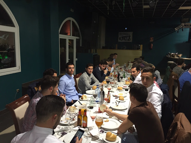Misma mesa vista del fondo norte con nuestro delantero centro Rubén niquelao de azul,el artista el centro del campo,canterano y juvenil ANTOÑITO a su lado,junto al bueno de DANI MERCHAN,que tiene enfente a nuestro capitán NANDY,muy pensativo,todo lo contrario que el de Nogales BORJA,que esta animando la mesa.